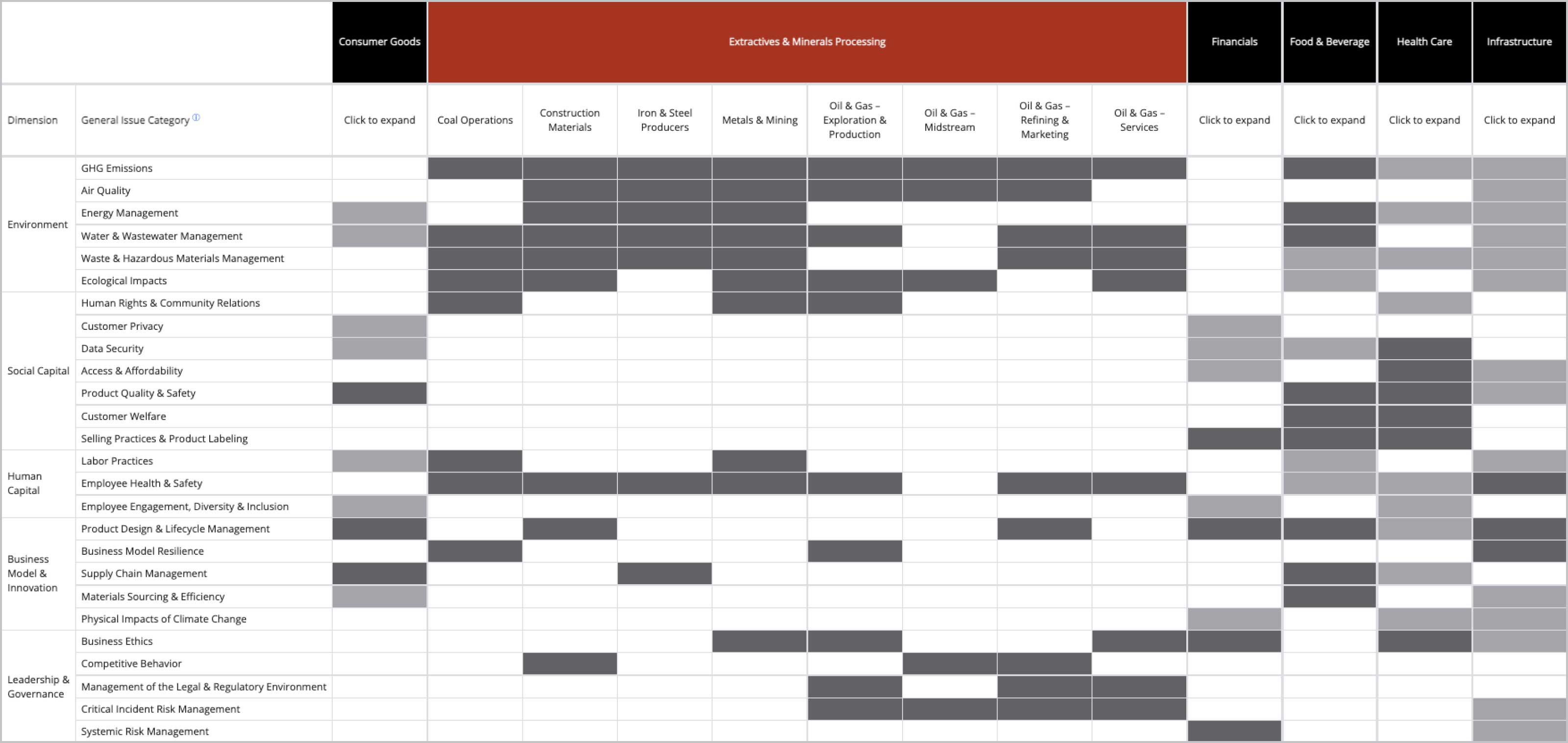 - The Materiality Map highlights 26 general sustainability issues across 77 industries.